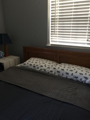 Casual comfort meets modern style in this soft, prewashed cotton blend quilt set featuring a washed denim blue yarn dye face reversing to solid chrome gray. Our Eddie Bauer Hidden Lake quilt set is as stylish and comfortable as your favorite denim jacket, but the subtle geometric patterning in the block quilt stitching gives it a modern edge. Keep it crisp and modern with solid color sheets, or layer in some signature Eddie Bauer decorative touches with novelty flannel sheets, a bear appliqued pillow, and a cozy faux fur accent pillow to complete the look. Twin quilt set includes: one twin quilt (88"l x 68"w) and one standard sham (21"l x 27"w), full/queen quilt set includes: one full/queen (90"l x 90"w) and two standard shams (21"l x 27"w), king quilt set includes: one king quilt (96"l x 104"w) and two king shams (21"l x 37"w).