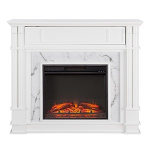 Sold as a set of multiple boxes. Conjure a romantic feel with this white on white electric fireplace. Linear woodwork encapsulates crisscross hatching of lifelike marble veneer. Designed as an entertainment console,beautifully convenient beneath a wall mounted TV; a recessed-door shelf hides the mess of media equipment. Warm up your living space with this classically inspired entertainment center fireplace - a must for any home. True to life. This electric fireplace saves energy with long-lasting, cost-effective LED bulbs, while igniting ambience with realistic flames and supplemental heat. No professional installation required, simply plug into any standard outlet. Control from your favorite easy chair with the easy-to-use remote control. When you crave the look, but not the heat, turn on just the flames and enjoy year-round.