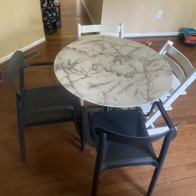 Got the white and gold one. Easy to build. Comes with all tools needed. Not too heavy. Got it done in less than 30 minutes by myself. The nut that holds the base to the center leg of the table must be tightly screwed on firmly because the nylon ring inside the nut is supposed to prevent the nut from becoming loose over time. I put on a garden glove that has extra grip so that I can tightly screw the nut on using the wrench. It’s true that there is cracking on the table when screwing on the four screws to attach the table to the center leg. I did this as gently as I could and made sure to tighten it as much as I could but the table top is still slightly wobbly if you press down on it. It looks good but I’ll need to keep using it to determine the stability and quality over time. I’m also going to get a pvc table top protector for it. Not the type of table that you can stand on or lean all of your body weight onto. More like for just eating, drinking coffee, or working on your laptop. Perfect for a small dining room. It fits comfortably 4 bistro chairs and snuggly 5 bistro chairs. Good cheaper option table especially when it’s on sale.