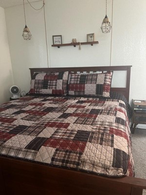 Rich in color, the Hilltop 3 Piece Reversible Printed Quilt Set offers a lodge style update for your bedroom. This reversible rustic quilt features a patchwork print, in bold hues, for a cabin-inspired look. The solid reverse showcases a clean and inviting all-over windowpane print to complement the top of the quilt. Zipper closures on the 2 matching reversible shams create a clean finished edge, while cotton-rich filling and channel quilting provides a soft hand feel. Machine washable for easy care, this reversible quilt set brings a warm cabin look to your bedroom decor.