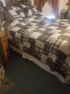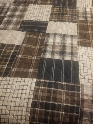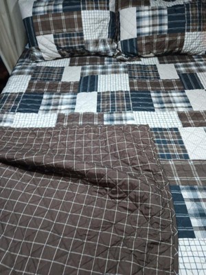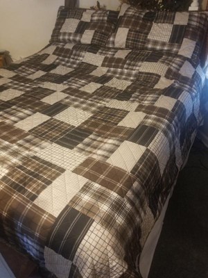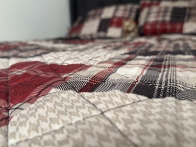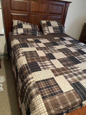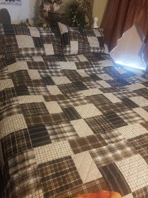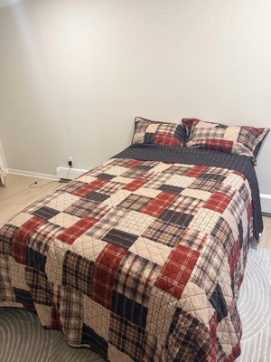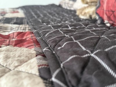 - Reversible rustic quilt set features patchwork print reverses to all over plaid