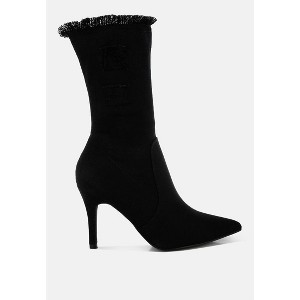 Introducing your new favorite distressed denim calf boots, straight from the '90s! With a convenient zipper closure, frayed raw-edge trim, and a classic stiletto heel, these boots are total head-turners. Featuring stylish paneling detail and a 3.5-inch heel, they're perfect for rocking a chic denim-on-denim look. Type: Boots Upper Material: Denim Outer Sole: TPR Closed Pointed Toe Paneling Detail Frayed Trim on Hem Side Zipper Closure Distressed Detail Stiletto Heel Heel Height: 3.5 inch SH5028
