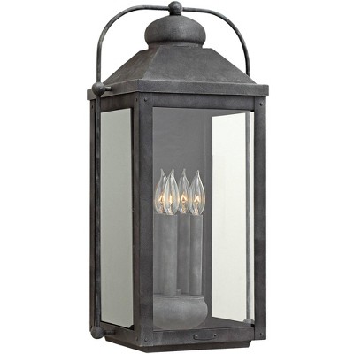 This aged zinc finish outdoor wall light has an early American lantern design. The body features arched carriage handles and a sturdy knobs. Two candelabra bulbs and seedy glass panels, complete this classic look. From the Anchorage collection by Hinkley.