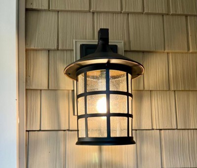 - Matte black finish. Cast aluminum. Clear seedy glass.