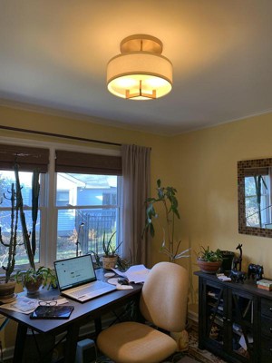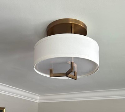 With a minimalist frame and a sleek brushed bronze finish, the Hampton semi-flushmount ceiling light is a stylish addition to both modern and transitional decor. It features a crisp off-white linen drum shade with a decorative etched acrylic lens, for a gentle glow. From Hinkley.