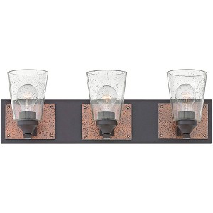 Hinkley presents a masterful blend of motifs that incorporates rustic industrial with elegant and modern. Its Buckeye bronze finish steel rectangular frame features hammered accent plates. Three clear seedy glass shades bring an elegant touch. This contemporary three-light wall bath light delivers a fashionable natural look to a modern space.