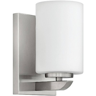 Bold, but minimalist in the same moment, this contemporary two-light wall sconce lends a refined, composed look to any room in the home. A stylish addition, the sconce is complemented with a brushed nickel finish. Its cylindrical shade boasts etched opal glass for beautifully diffused illumination. Subtle curves perfectly complement this creation from the Kyra collection by Hinkley.
