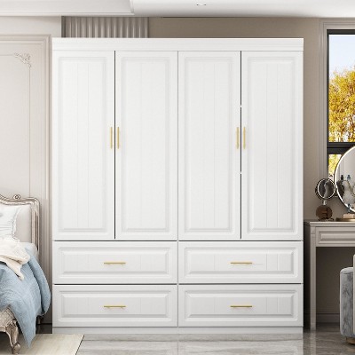 This 4-door wardrobe with mirror and 2 drawers is the perfect storage solution for your clothes, accessories, and other items. Its elegant style, combining white board with golden handle, will match any home decor, while the ample storage compartments and drawers provide plenty of space for all your belongings. Made of durable engineered MDF board, this wardrobe is strong and sturdy, and the mirror on the door adds convenience to your daily routine.