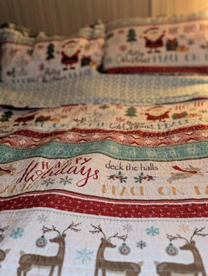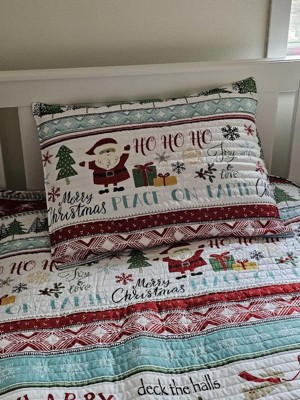 - THE SET: A fun, whimsical holiday quilt and one sham, this quilt set is part of the Levtex Home Ho Ho Holidays collection. Used by itself, as a layering piece or as a bedspread, this quilt is extremely versatile.