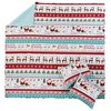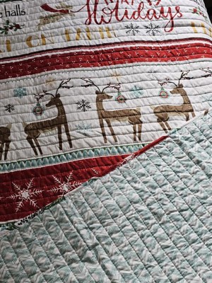 The Ho Ho Holidays Reversible Quilt Set by Levtex Home is inspired by the joy and cheer of the holiday season. Offered in red, green, white and teal, this design will immediately transform your bedroom. This reversible quilt features rows of holiday patterns, deer, Santa , snowflakes and Christmas trees on the front, reversing to a teal and white geometric pattern on the back. The Quilt and Sham have a microfiber front and back, filled with a cotton-rich filler, and are machine washable. Enjoy this for years to come!