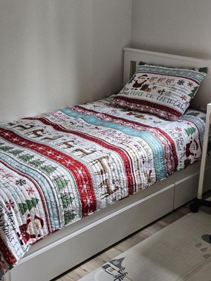 [This review was collected as part of a promotion.] My son is absolutely delighted with the colorful, cheerful design of this quilt set from Levtex home. It adds a wonderful holiday vibe to his room, making it feel cozy. The quality is excellent, and the twin size is perfect for his bed. The matching sham completes the look. The material seems durable and easy to care. The set is also machine washable. A great purchase for the holiday season! I would highly recommend this quilt set for others.