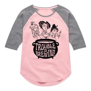 Hocus Pocus - Trouble is Brewing - Youth Girls Raglan Graphic T-Shirt - Put a spell on your style with Hocus Pocus graphic apparel, featuring the Sanderson Sisters and magical moments from the cult-favorite Halloween classic.