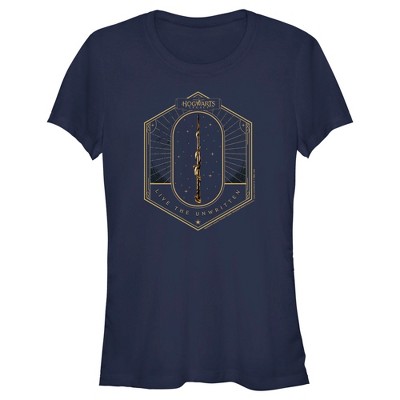 Celebrate your favorite fantasy creatures with this Hogwarts Legacy tee. The shirt features a gold image of a graphorn's head in front of a window while white letters below the image read, "Live The Unwritten." The game's logo appears under the graphorn's head. The tee comes in a navy short sleeve crew neck. Fans of the Hogwarts Legacy video game will love this comfy cotton t-shirt.