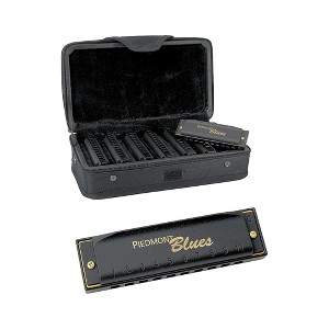 The Hohner Piedmont Blues 7-Harmonica Pack with Case is a super value. Includes 7 harps with Hohner-quality brass reeds, aluminum plates, precision-molded combs, and a plush-lined nylon case. Keys: G, A, Bb, C, D, E, and F (lowest to highest). Hohner includes a Bb harp for playing cross-harp in the key of F—a favorite key of harmonica greats like Little Walter.