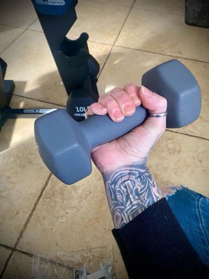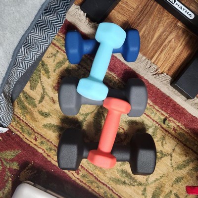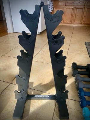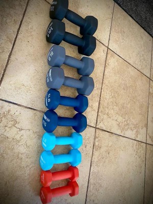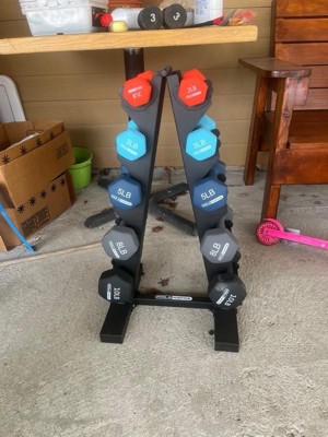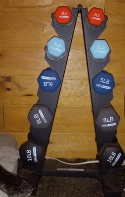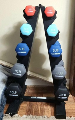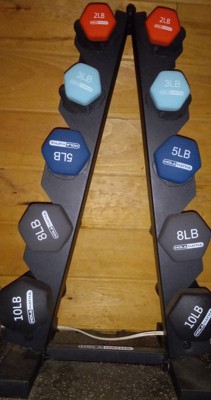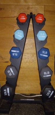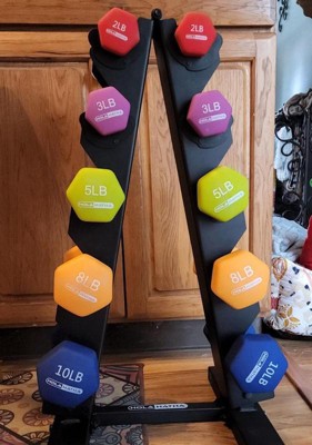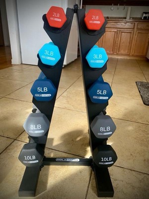 [This review was collected as part of a promotion.] First off the rack is small enough to store anywhere that is convenient in your home and displays the weights nicely for easy access of use. The weight range is nice in 2, 3, 5, 8, and 10 lbs. so you can have a variety of weight range for your exercises. The weights themselves are neoprene which give you a nice grip to hold onto as well as the ease of cleaning. I love that the ends of the weights are hexagon shape so they stay in place when you set them down. These weights are definitely not going to roll away from you. I would highly recommend this set for anyone who wants to add a little weight to their exercise routine without spending a fortune.