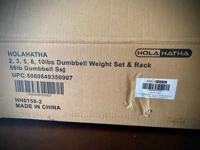 HolaHatha 2, 3, 5, 8, and 10-Pound Neoprene Coated Grip Hexagon Dumbbell Weight Set with Storage Rack Stand for Various Strength Training Workouts