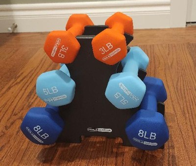 [This review was collected as part of a promotion.] I recently started to workout at home and got this dumbbell set. It arrived very well and nicely packet and was very easy to install the storage rack. The 3 dumbbell sets are each 3,5 and 8 pounds. Great for any type of workout that requires dumbbells and very fun colors.