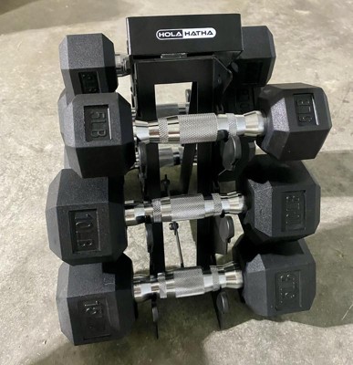 WARNING:Take your exercise routine to the next level and challenge yourself with the HolaHatha 5-, 10-, and 15-Pound Hexagon Dumbbell Free Hand Weight Set with Rack in Black.