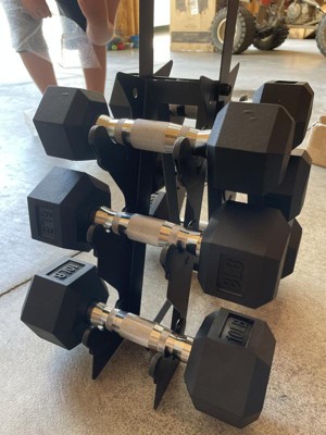 [This review was collected as part of a promotion.] We received our HolaHatha Hexagonal Dumbbell Free Hand Weight Set With Rack These are amazing, great quality, the rack also has a handle, and with a slim design It did have a rubber ish smell when we unpacked it, but went away a in a couple of days With 5lb, 8lb, and 10lb weights it's good for the whole family, and beginner to experience We recommend this product