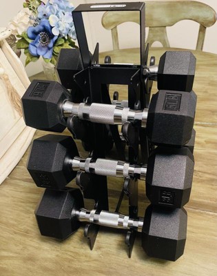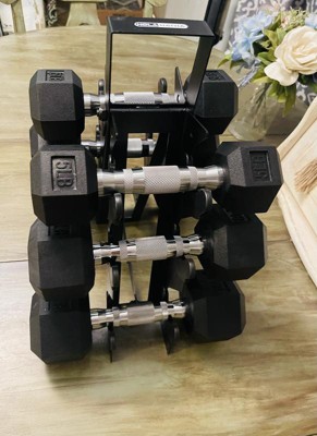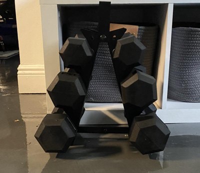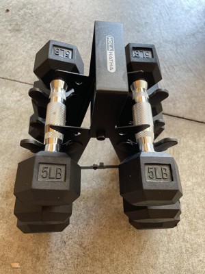 [This review was collected as part of a promotion.] The HolaHatha Hexagonal Dumbbell Free Handweight set has been such a nice addition to my home workouts. It comes with 5lb, 8lb, and 10lbs dumbbells and a super sleek rack to store. I love the matte black look so that storing in the open doesn't look bad at all in my home.