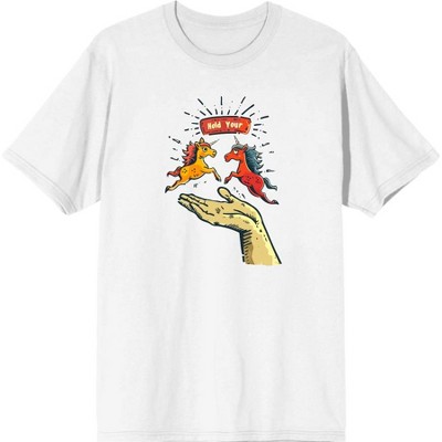 Show the world your funny side with this apparel featuring a big, colorful graphic of two horses in the palm of a hand - "Hold Your Horses!" - an eye-catching and humorous image that has been professionally printed for long-lasting print quality. Thoughtfully designed for comfort and style, this apparel is made of high-quality materials that make it perfect for all-day, any-day wear. And when it's time for cleaning, simply machine wash it cold and tumble dry on low for effortless care.