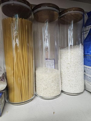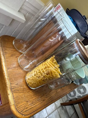 [This review was collected as part of a promotion.] I love these they’re so cute and air tight can fit about two pounds of pasta in them they are glass so goes with any other decor they are a bit thin I was afraid it’ll break washing them
