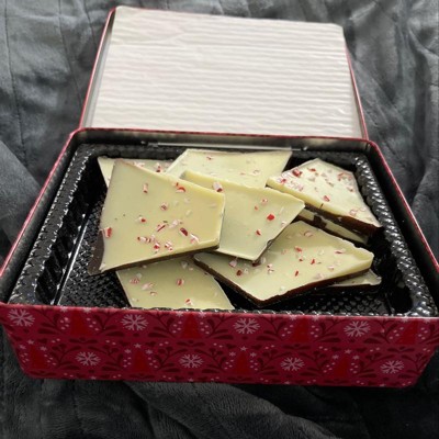 The perfect peppermint bark! Chocolate is easy to eat, not hard on the teeth. The peppermint isn’t overwhelming. There is a perfect balance of white and dark chocolate. Not too sweet. I also love the tin!