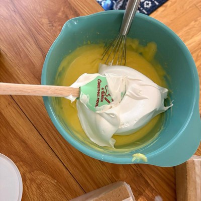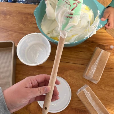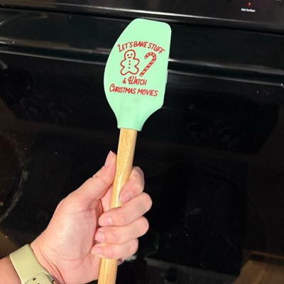[This review was collected as part of a promotion.] Love this cute green spatula with a saying that makes me smile every time I read it. The spatula itself is very durable with a sturdy wooden handle and soft & flexible yet a little firm spatula part. It has gone through the dishwasher with no issues and I have enjoyed using it for my holiday baking!