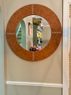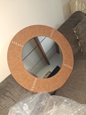 [This review was collected as part of a promotion.] Beautiful light brown with contrast stitching faux leather round mirror. This is very well made and looks perfect with my decor. This is a great size and I love the rustic look. Easy to install and is a great addition in my entryway.