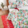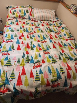 - THE HOLLY JOLLY DESIGN: One of our most popular sets, Holly Jolly is fun and whimsical. The front is a family heading home through a forest of trees with their Christmas tree strapped to the car and the reverse is red, teal and white stripe. Button closures at the bottom of the duvet cover are durable and easy to use.