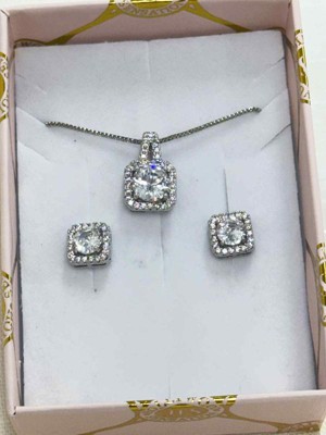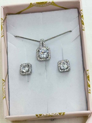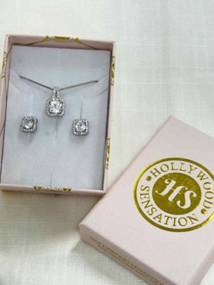 Hollywood Sensation's crystal pendant necklace the Katelyn Necklace is a Crystal Pendant Necklace for Women and Gabriela Square Simulated Diamond Studded Earrings. This beautiful pendant necklace and earring set are perfect for any night out or even a red carpet event.