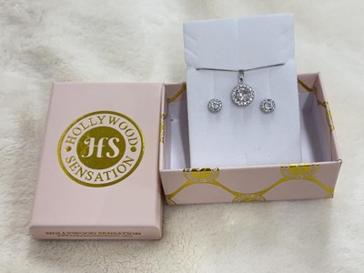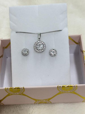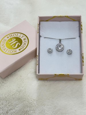 Hollywood Sensation White Gold Cubic Zirconia Necklace Set with Cubic Zirconia Halo Earring Settings 18 Inche Silver