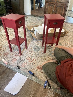 Super slim FLW Navajo red tables Just a hint of vintage. Tall and slim easy to assemble and ideal for small space Messy photos. Must upload more when I've sorted that quilt Bright well made addition to a room What Target does best