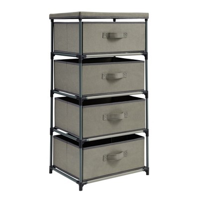 - Sleek Design: Combining a linen pattern drawers with the particle panelling and steel frame, this Dresser Storage Tower is perfect for integrating with other furniture around the house.