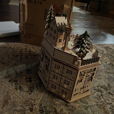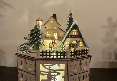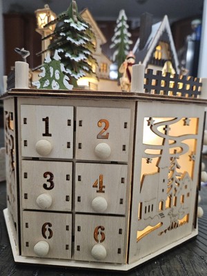HOMCOM Christmas Advent Calendar, Light Up Table Xmas Wooden Holiday Decoration with Countdown Drawers and Village, for Kids and Adults, Natural