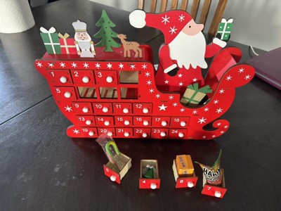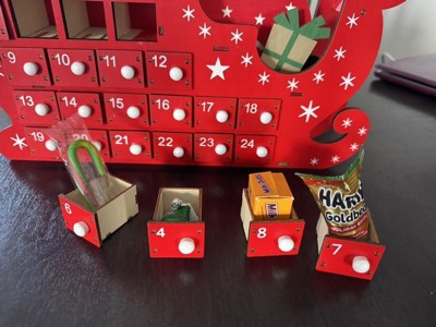 Very cute adventure calendar but the drawers are sooooo small you can’t fit mini candie canes or small individual chocolate bars. Smallest item I could fit was a Hershey kiss but my daughter hates chocolate.