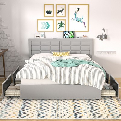 Transform your bedroom with the HOMCOM queen bed frame with storage where style meets functionality. This queen platform bed frame offers comfort. It's wrapped in chic linen-feel fabric. It features four spacious drawers on wheels to tuck away your essentials. It's supported by a strong steel frame with wood slats and legs. Enjoy a clutter-free sanctuary with this upholstered bed frame from HOMCOM.