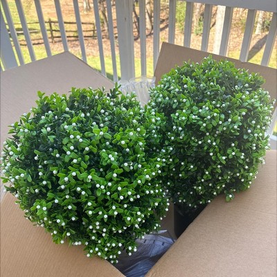Just received my topiaries and they look great. I’m excited to put them outside in pots. We live in the south and also face southeast so I’ve tried many plants outside my house and not very many can handle the sun/heat all summer. I also get a lot of ants whenever I have live plants outside my door. So I’m excited to have some faux plants this year and these look great and the price was amazing too for the quality. They come with a nice looking pot and also moss to put around the base. Also additional flowers and greenery if needed. I attached pictures, but haven’t fluffed them yet. Definitely recommend.