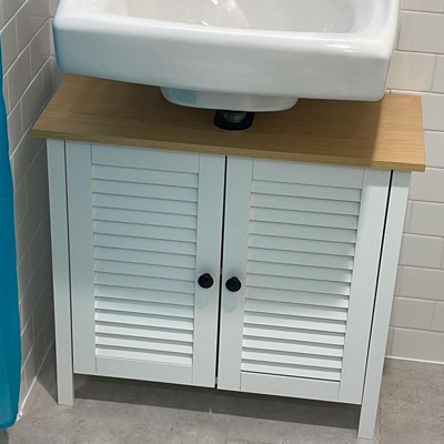 - Goes With Everything: This under sink storage cupboard comes in a clean, painted finish that matches any decor you have in your bathroom.