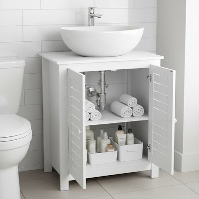 Maximizing space in your bathroom has never been easier, thanks to this undersink storage for bathroom cabinet from HOMCOM. An elegant styling and white color give it an easy and versatile feel which blends into the room with ease. It's made from an MDF board for supreme strength, with the 'U' cut out allowing it to slot in snuggly around your sink and pipes. The two-layer shelves cater to your various storage need. Just worth your purchase!