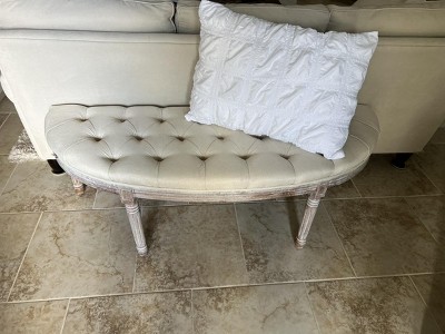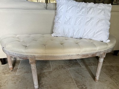 Bench is exactly as pictured and the color of the wood legs are more of a whitwashed neutral tan/beige color. Definitely NOT a “true white” tufted top as one reviewer posted. As you can see from the pictures, it’s a light creamy beige color (added a white pillow for color reference). If this is what you’re looking for, you will be happy with the color, sturdiness and look - perfect for the foot of my queen bed.