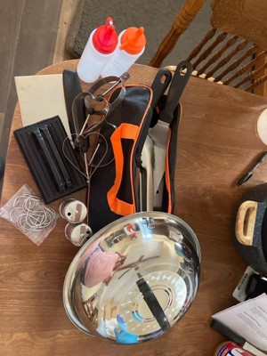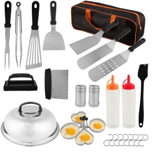 Enjoy camping and outdoor dining with the 28-Piece Grill Utensils Set by Home-Complete. This set of BBQ accessories comes with 4 egg rings, a long griddle spatula, a slotted grill spatula, a griddle scraper, a meat knife, grill tongs, a chopper, a cleaning brush, a fish turner, a grill fork, basting brush, a griddle dome, 2 squeeze bottles for water or oil, 2 spice shakers, and 8 hanging hooks — all of which can be conveniently stored in the included carry bag for compact storage and organization. This grill kit provides you with everything you need to make delicious meals for breakfast, lunch, and dinner on your griddle at home or while camping and makes great grilling gifts for men or women.