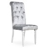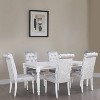 Introduce elegance into your dining room with the Home Design 7 Piece Reston Dining Set, designed to comfortably seat six. The rectangular tabletop is supported by four turned legs and accented with a table apron embellished with shiny rhinestones, adding a touch of sophistication to any meal. The parson chairs feature tufted backrests adorned with diamond buttons and boast a stylish roll-top design. Cushioned for optimal comfort, these chairs elevate your dining experience with both luxury and practicality, making the Reston Dining Set a perfect centerpiece for gatherings and everyday meals alike.