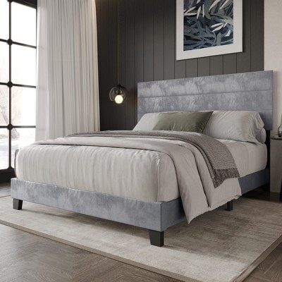 Presenting our contemporary upholstered platform bed frame, a refined and modern addition to enhance any bedroom. This bed features a minimalist design, highlighted by a clean-lined, panel-style headboard that combines aesthetic appeal with subtle texture. The luxurious velvet upholstery provides a soft yet durable surface, while the sturdy low-profile legs offer both stability and an open, airy feel. Ideal for those seeking a simple yet sophisticated bed, this frame effortlessly complements a wide range of décor styles, blending modern elegance with practicality. Available in multiple sizes to meet your specific needs, the bed includes clear and easy-to-follow assembly instructions.