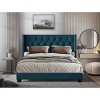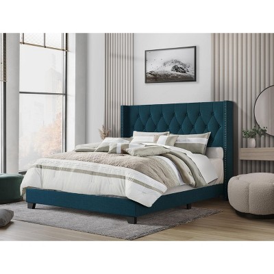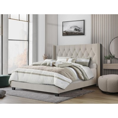 This tufted button upholstered panel bed is elegantly wrapped in high-quality linen fabric, offering a sophisticated and timeless look. The bed features a wingback design on both sides of the headboard, enhanced with nailhead trimming for a touch of refined detail. The headboard is cushioned with foam filling, providing added comfort and support when reclining. The bed is delivered with a set of slats, though it is recommended to use a box spring in combination with your preferred mattress for optimal support and durability. This beautifully crafted bed is a perfect addition to any bedroom, combining style and comfort.