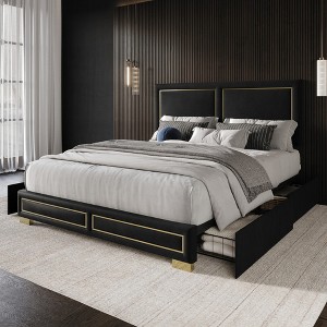 This upholstered platform bed blends luxe and modern elements to elevate your bedroom. The frame is crafted from a combination of metal, solid, and engineered wood, and it's wrapped in plush velvet with elegant gold trim. The rectangular headboard is foam-padded, offering comfortable cushioning for relaxing with a book before bed. What we love most? Four built-in drawers provide convenient storage for clothes, linens, and other essentials, helping you keep your space organized. With slats and center legs, the bed eliminates the need for a box spring, so all you need is your preferred mattress (sold separately).