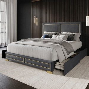 - Wrapped in plush velvet with sleek gold trim, this bed brings a touch of elegance and contemporary style to any bedroom.