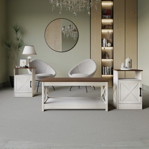 Bring warmth and style to your living room with this modern farmhouse coffee table set, blending rustic charm with functional design. The centerpiece coffee table is crafted with a sturdy wood frame and features decorative X-frame side panels that enhance both its structural support and visual appeal. Available in two color options—a classic full brown finish or a trendy mix of light gray and brown wood top—this table easily complements a variety of home décor styles. The set includes compact end tables, each measuring 15.7" W x 11.8" L x 23.8" H, designed with a single cabinet, swing-open door, and wooden hinges for discreet storage. With its cozy, clean-lined design, this set creates a welcoming and practical addition to any living space.