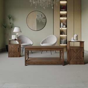 Bring warmth and style to your living room with this modern farmhouse coffee table set, blending rustic charm with functional design. The centerpiece coffee table is crafted with a sturdy wood frame and features decorative X-frame side panels that enhance both its structural support and visual appeal. Available in two color options—a classic full brown finish or a trendy mix of light gray and brown wood top—this table easily complements a variety of home décor styles. The set includes compact end tables, each measuring 15.7" W x 11.8" L x 23.8" H, designed with a single cabinet, swing-open door, and wooden hinges for discreet storage. With its cozy, clean-lined design, this set creates a welcoming and practical addition to any living space.