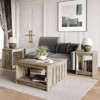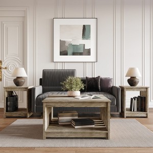 Bring warmth and charm to your home with this rustic, farmhouse-inspired coffee table set. Featuring one coffee table and two matching end tables, this set is designed to create a cozy and inviting living space. Each piece showcases slatted wood sides for a classic, handcrafted look. The coffee table offers a spacious top and an open lower shelf for added storage, while the end tables echo the same design—perfect for displaying lamps, books, or decor. Each end table measures 17.7 inches in width and length, and stands at 21.7 inches height. With its natural textures and laid-back aesthetic, this set is the perfect addition for those who love rustic style and functional design.
